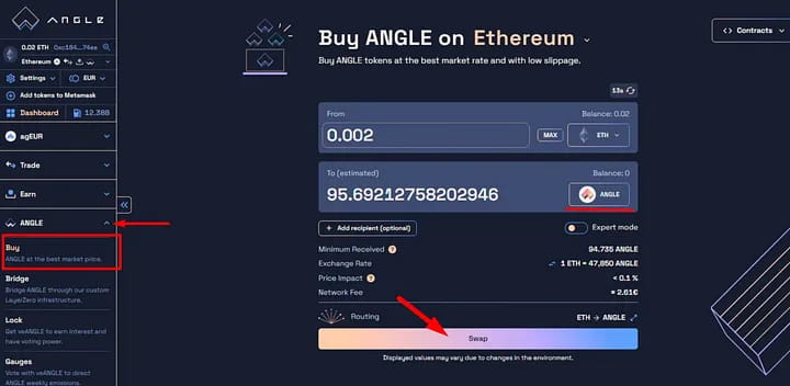 В разделе покупок ANGLE купите $ANGLE (требуется плата за газ в размере 2,5U в сети ETH).