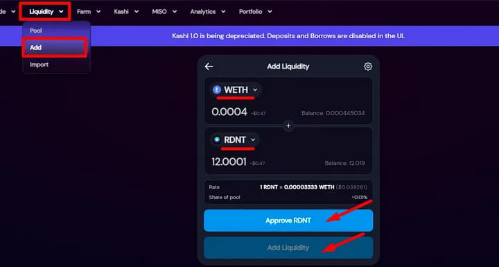 В разделе «Ликвидность» выберите «Добавить», выберите токен wETH-RDNT и его количество и подтвердите;