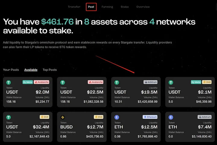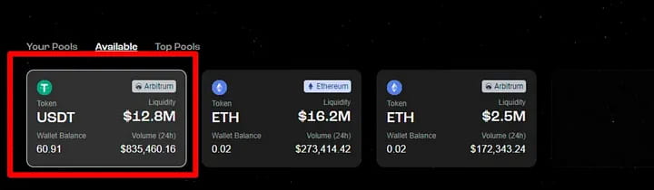 Переключитесь на «Пулы», и вы сможете выбрать пул для добавления ликвидности. Выбираю пул в сети Арбитрум: