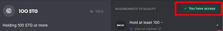 Если у вас есть как минимум 100 STG в любой сети, вы можете получить роль 100 STG, которая может стоить 40U и которую можно приобрести на Pancake Swap;