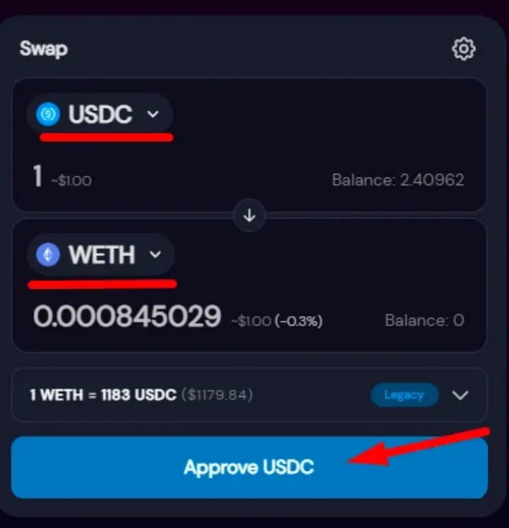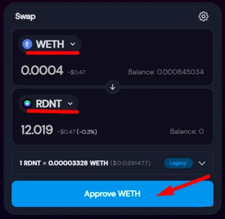 Если у вас нет токенов wETH и RDNT, перейдите на SushiSwap, чтобы купить их.