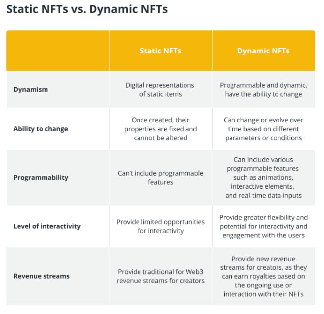 Статические NFT фиксированы и представляют собой одну версию цифрового актива, тогда как динамические NFT программируются и могут быть изменены или скорректированы в зависимости от конкретных условий или входных данных. Оба типа NFT обладают уникальными свойствами и могут использоваться в различных приложениях, в зависимости от конкретных потребностей и требований варианта использования.