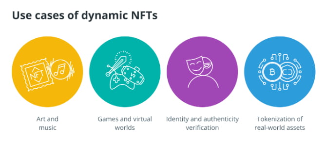 Динамические NFT имеют широкий спектр потенциальных вариантов использования, выходящих за рамки традиционных приложений статических NFT, таких как цифровое искусство.