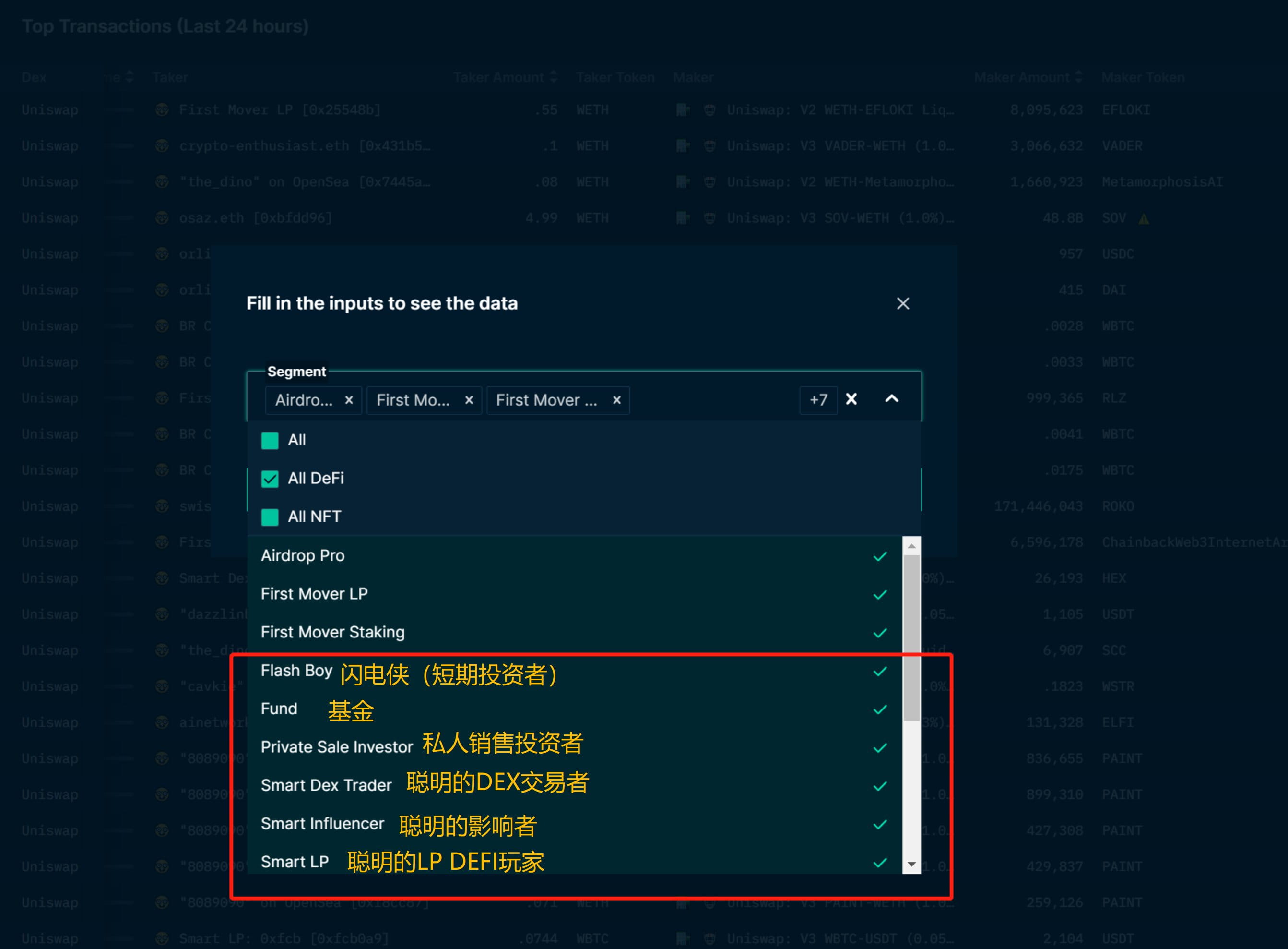 4.#Smart#Money В этом списке функций ядро должно использовать хороший фильтр, поскольку основным барьером#Nansenявляются миллионы адресных тегов, а каждый эмодзи представляет собой тип группы людей, умеющих тратить деньги. В нем много, 👇 👇 как показано на картинке. Создайте различные классификации фильтрации на основе ваших собственных привычек использования. Лично я в основном использую фонды и умных трейдеров DEX. Установите флажок, и список будет отфильтрован из больших данных.