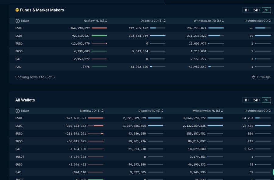 10. Данные стейблкоина. Направление потоков стейблкоинов на самом деле является очень ключевым индикатором. Основное зависит от действий фондов и маркет-мейкеров, а также общей ситуации на рынке. Испытывают ли стейблкоины чистый приток или чистый отток на биржи? Вероятность увеличения чистого притока высока, а вероятность сокращения чистого оттока высока. 👇👇На картинке показана ситуация с данными за последние 7 дней.