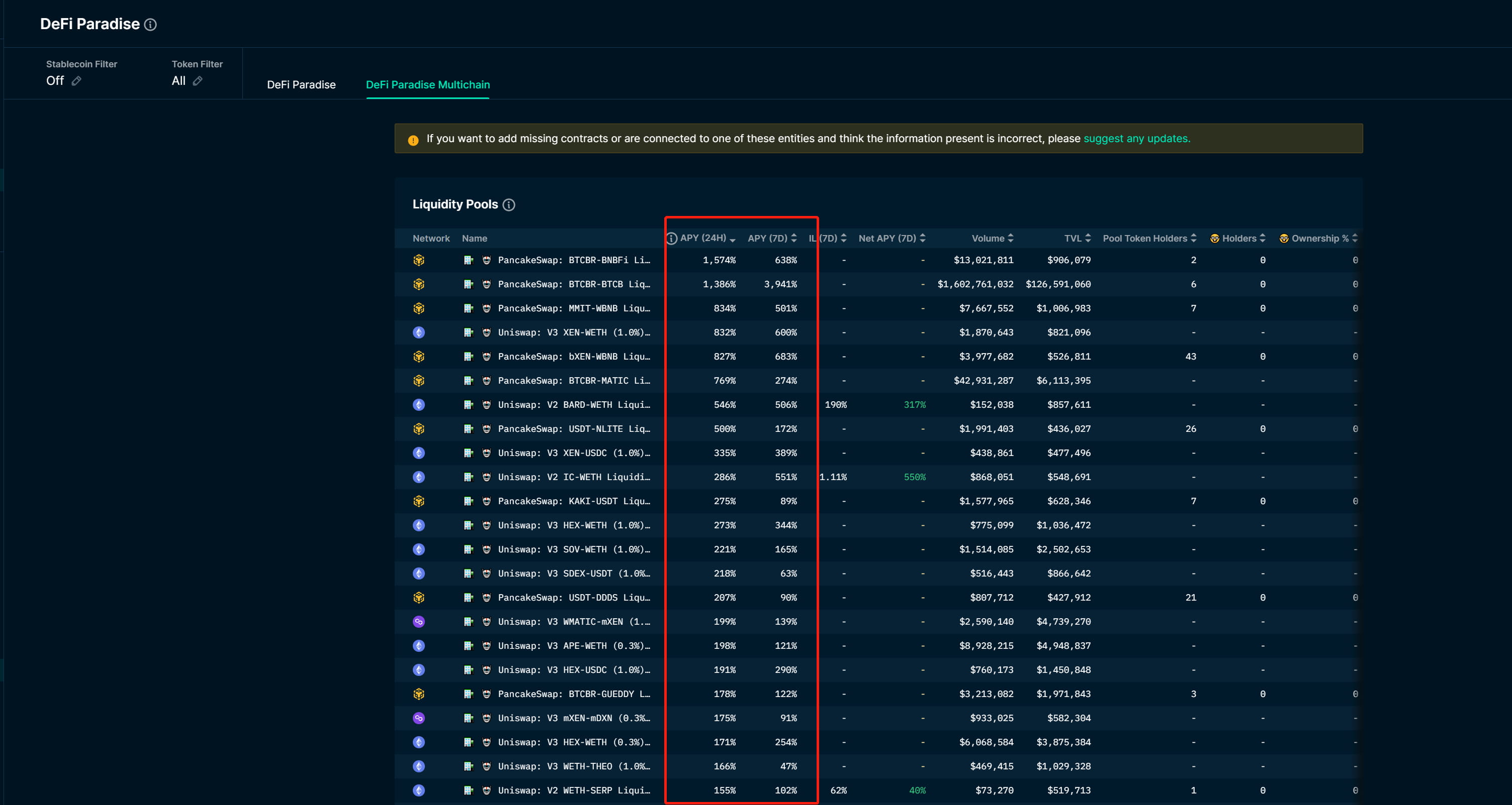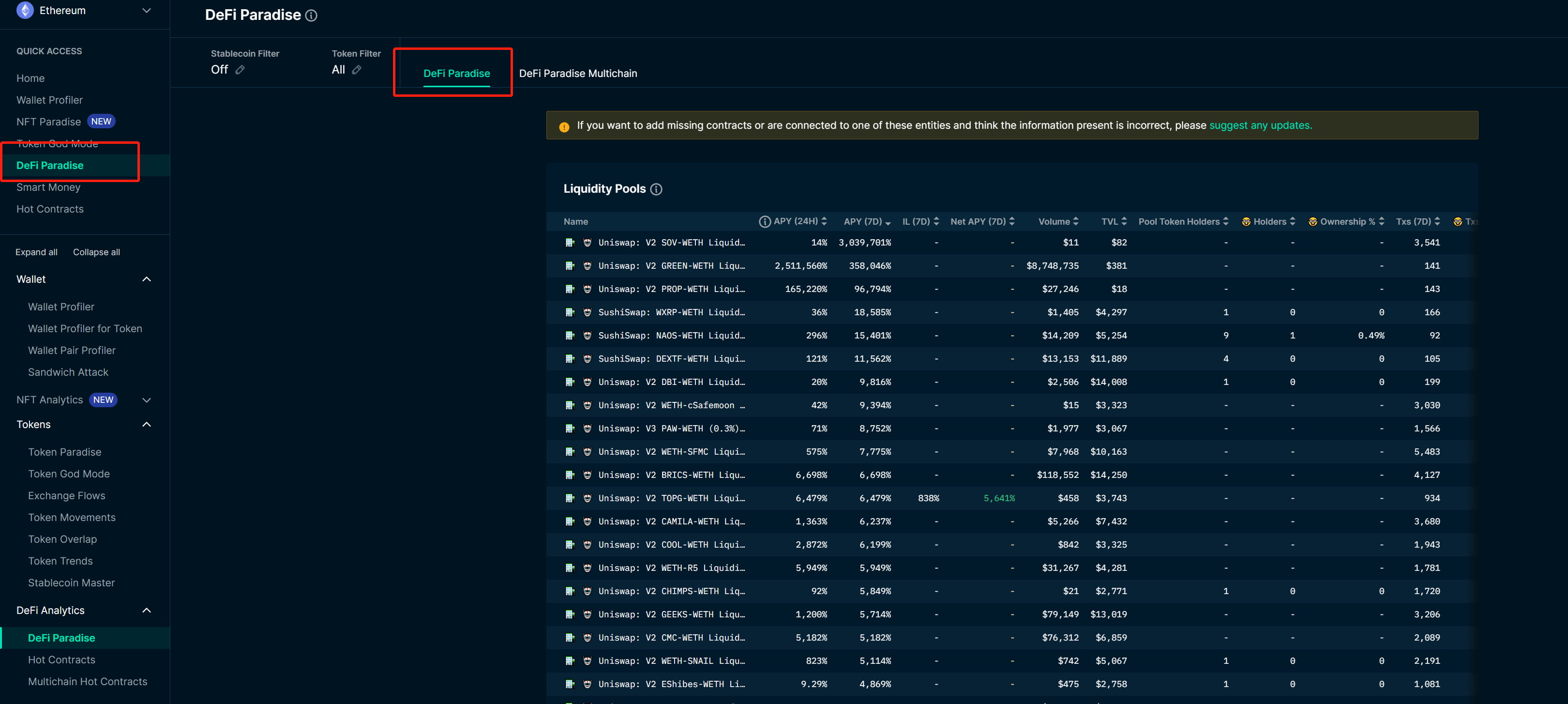 3.#DEFI#Paradise В этом списке функций есть несколько фильтров, в том числе рост пула капитала от 24 часов до 7 дней, ситуация с APY, ситуация с TVL, держатели пулов для майнинга, держатели умных денег и т. д., которые можно просмотреть в нескольких измерениях. , особенно для ранних проектов, имеет быстрый рост данных и высокую долю умных денег, поэтому часто стоит копнуть глубже. (Единственный недостаток заключается в том, что#Nansenтеперь медленно поддерживает проекты в цепочке L2)