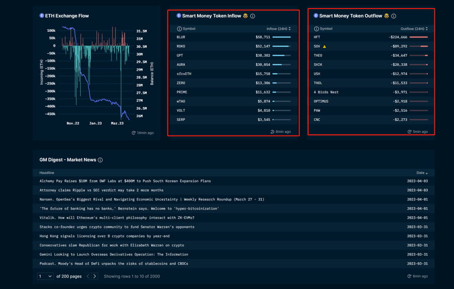 1. Первым делом выполните полное сканирование. Посмотрите, что сегодня покупают и продают умные деньги. Например, сегодня, 3 апреля, 👇 👇 Среди них умные деньги купили#BLUR#ROKO#GPT#AURA#ZEROи так далее. Среди них умные деньги продали#HFT#SOV#THEO#SHIK и т. д. Если среди них есть незнакомые проекты, зайдите на официальный сайт проекта, в Твиттер, проверьте и покопайтесь.