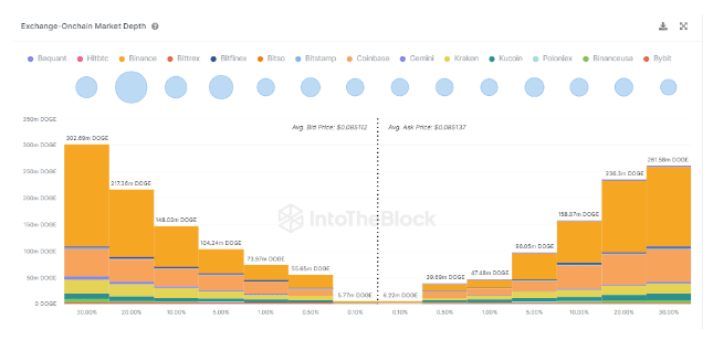 За последние 24 часа объем торгов DOGE на различных биржах увеличился на 30,7%. Между тем, торговые данные индикатора книги заказов IntoTheBlock показывают интересный обзор текущей борьбы за власть между быками и медведями. Согласно торговым книгам 14 криптовалютных бирж, отслеживаемым IntoTheBlock, в настоящее время быки имеют преимущество.
