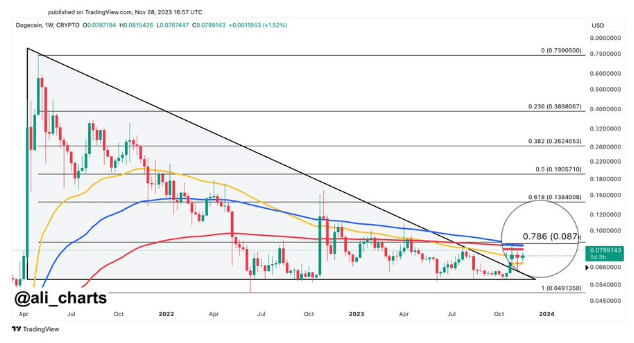 После достижения месячного минимума в $0,0565 в октябре, Doge поднялся на 21%, а затем в ноябре поднялся на 22%, что привело к образованию двух последовательных зеленых свечей впервые с октября 2022 года. Продолжая двигаться по этой траектории, за последние семь дней его цена выросла на 9,1%, что является одним из самых больших показателей среди ведущих криптовалют. Недавнее повышение цен привело к тому, что DOGE достигла $0,08715, самого высокого уровня с апреля 2023 года.