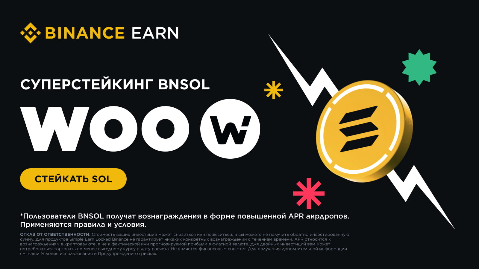 Пользователи должны завершить верификацию и использовать SOL для стейкинга BNSOL. Все BNSOL на соответствующих требованиям спотовых кошельках, кошельках для пополнения, кошельках Binance Earn, фьючерсных кошельках, маржинальных кошельках и Кошельках Binance принесут вознаграждения в форме повышенной APR аирдропов WOO.