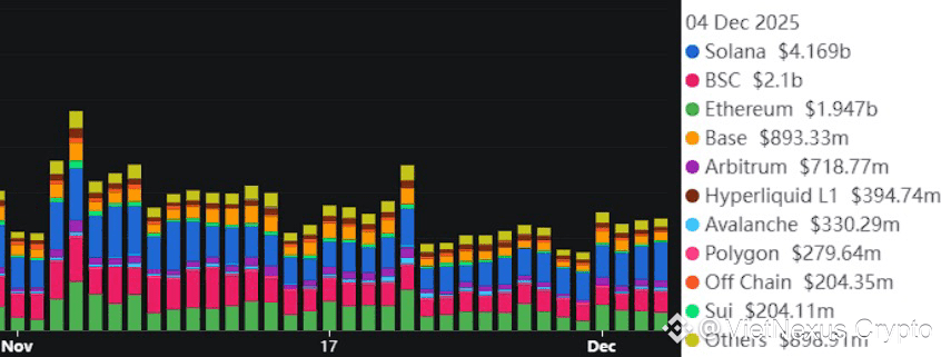 The Solana network also recorded a significant presence in the decentralized exchanges (DEX). Solana dominated the market in the past 24 hours, recording a volume of 4.16 billion DEX.