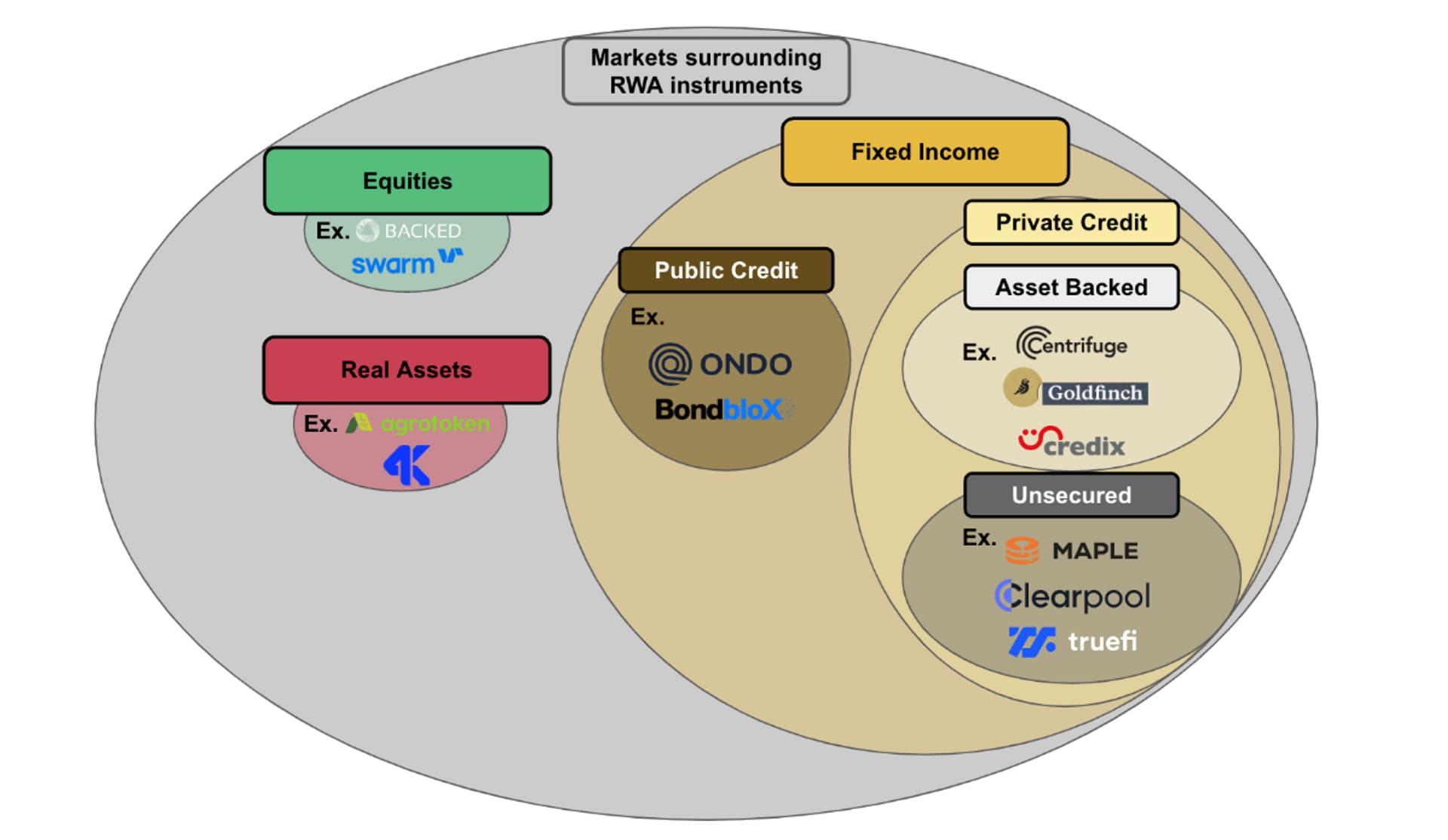 2. 固定收益:分为公共信贷和私人信贷。固定收益是RWA领域的主要市场。与股票或真实资产市场相比,基于RWA的固定收益市场在交易流方面更活跃,在产品方面更丰富,在市场参与方面也更多样化。支持私人信贷协议,如Centrifuge、Goldfinch或creditx。