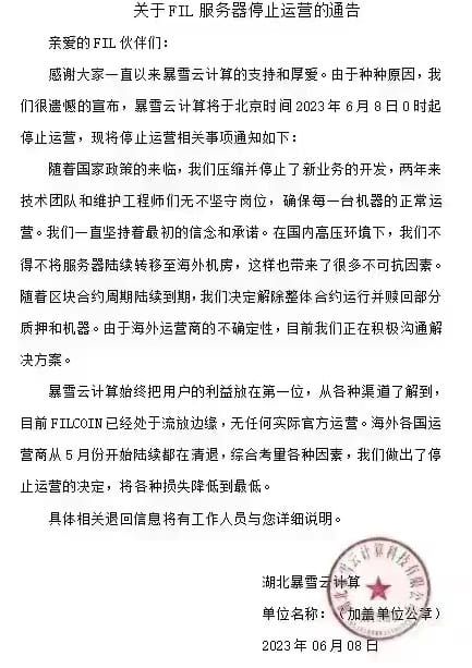 你看这家湖北暴雪fil的公告,各种原因坚持不下去,说白了就是没利可图了。人家矿商也说,fil目前处于流放状态,海外各国的运营商在5月就开始陆续清退,都没有运营了,那这个币还有啥炒作点。这不就是去中心化了。