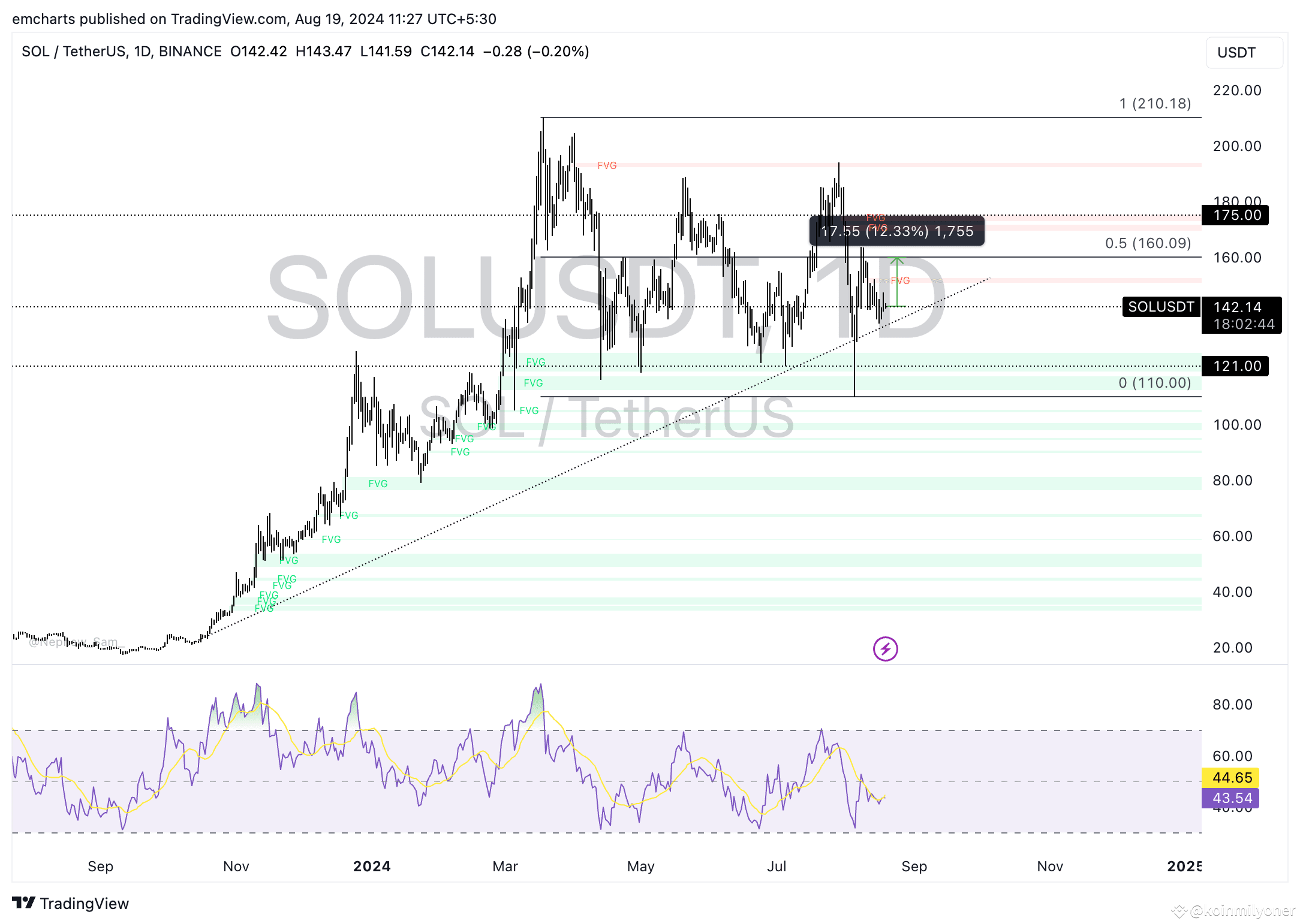 Since October 2023, Solana has been steadily increasing in value. The trend has been mostly flat as of late, with the Ethereum rival regaining its footing over $140 after a precipitous drop below $110 on August 5th. On the daily chart, the momentum indicator known as the Relative Strength Index (RSI) is showing a reading of 43.54, which is below the neutral level.