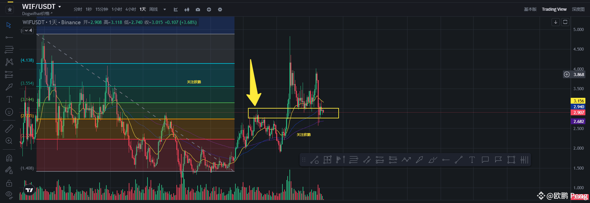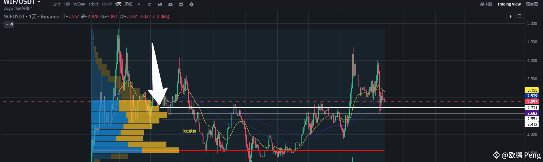 日线级别的K线图我们可以看到WIF已经回调到前方的高点位置2.9$附近(黄色箭头位置)