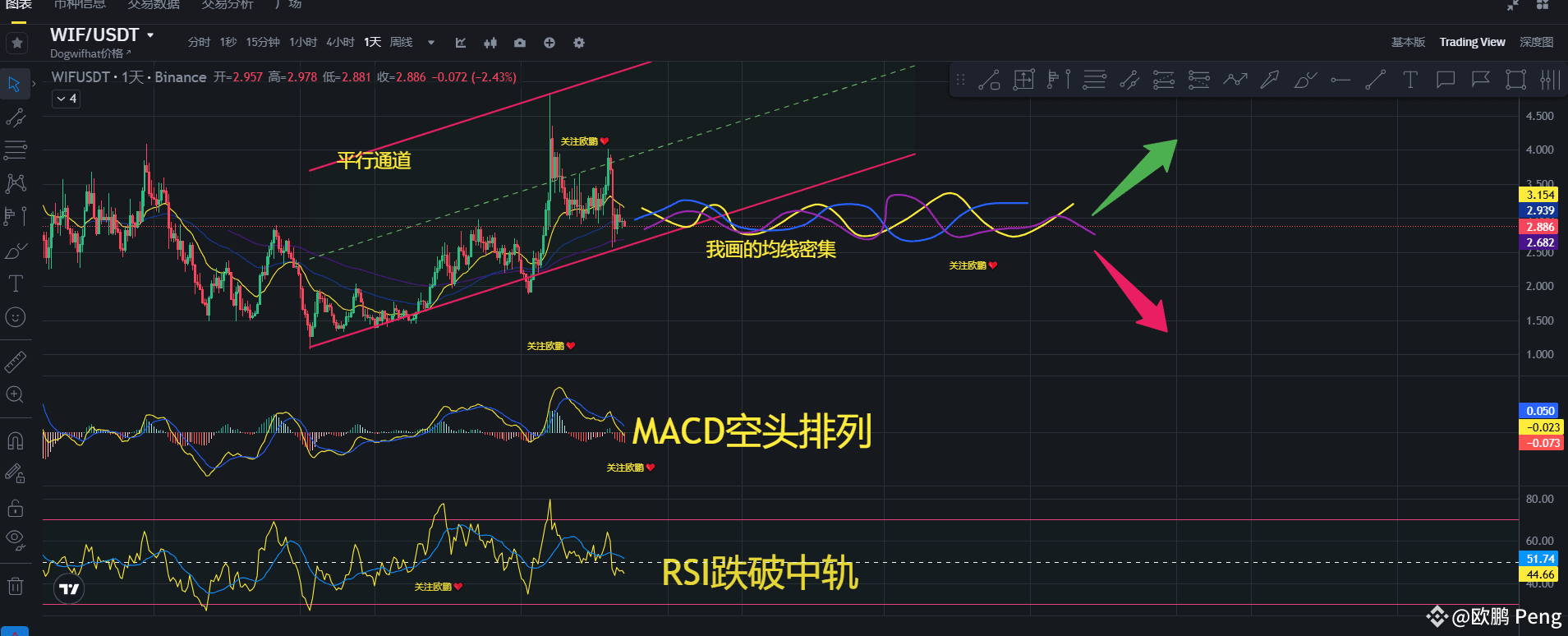 上图中我们可以看到,当前的价格仍然在平行通道趋势里面,中轨的下方,价格回调到平行通道的底线后再次回升震荡。而且日线的三条均线已经收口,按照收口方向我画了三条均线的延伸,我们可以看到后面会发生均线密集,然后会出现新方向!!!下方的MACD也是空头排列形态,红色动能柱逐渐增强,RSI也是跌破中轨空军主导。