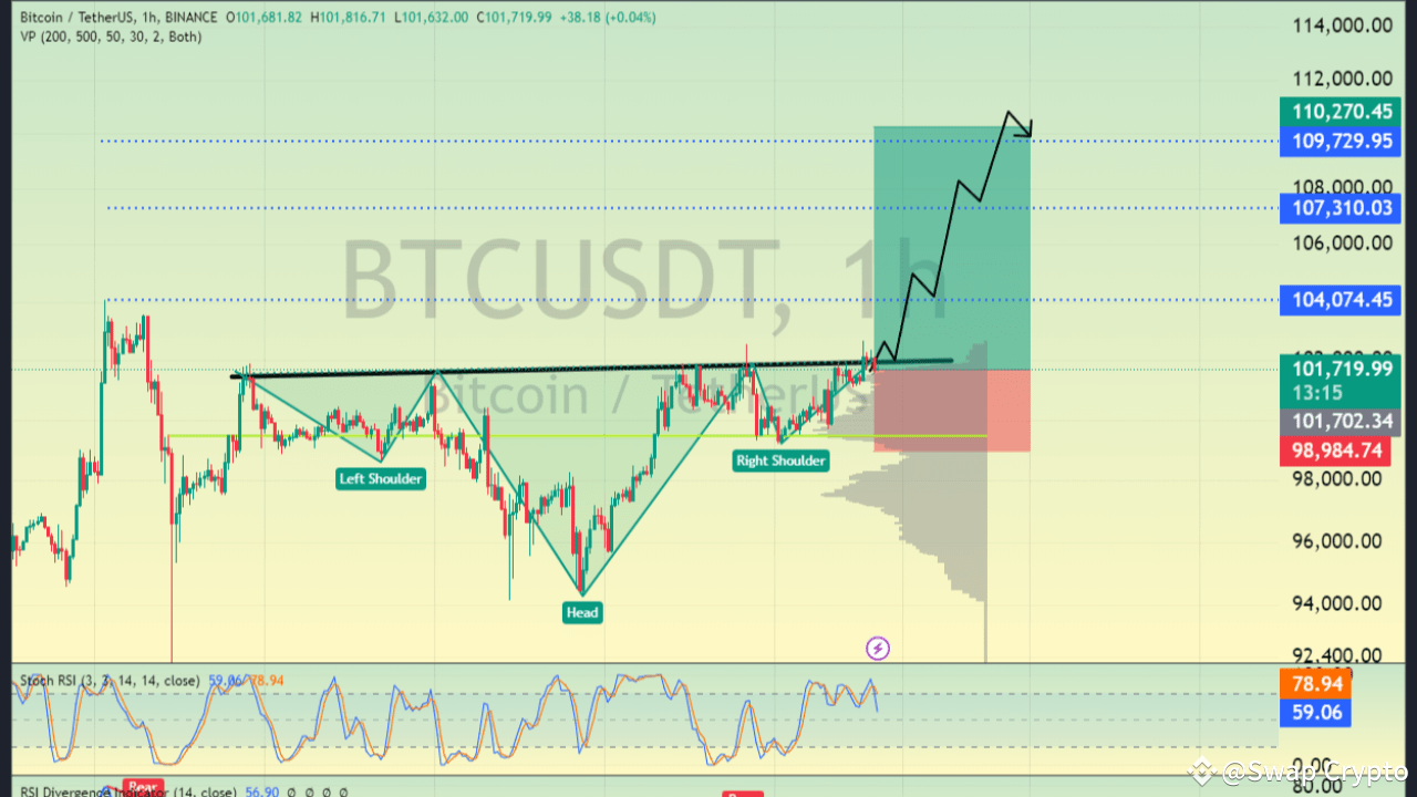 The BTC/USDT 1-hour chart highlights a completed inverse head-and-shoulders pattern, signaling bullish momentum. Breakout above the neckline confirms upward continuation toward $110,270. Stochastic RSI shows bullish crossover, reinforcing momentum. RSI divergence indicates strengthening trend, while VPVR highlights support around $98,984. BTC exhibits strong bullish sentiment, targeting higher levels.