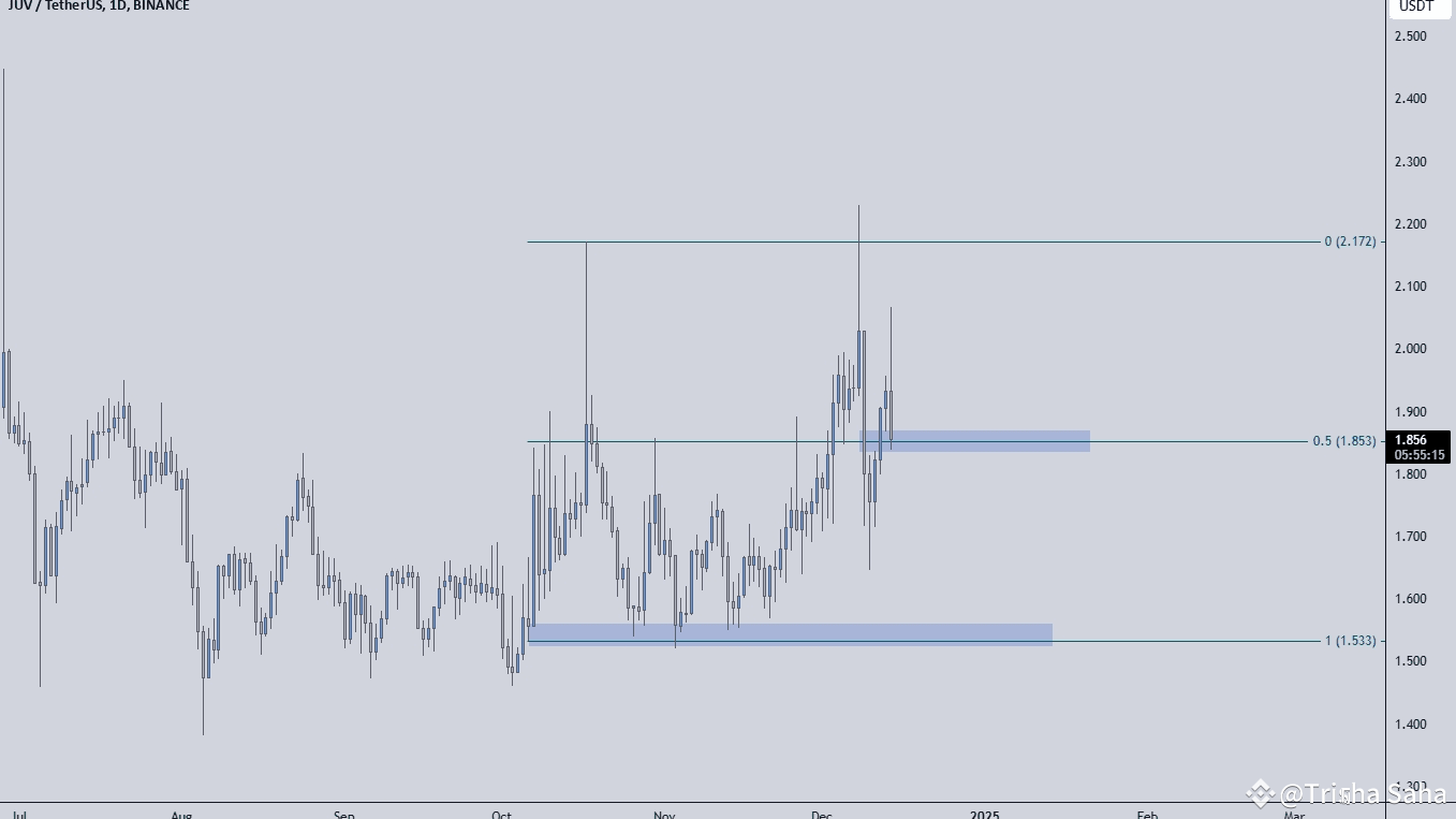 JUVUSDT ranks as the 3rd highest volume gainer this week, with a 177% increase in volume. While the price has been hovering near its lowest levels, demand points have been kept moderately higher to reflect potential movement.