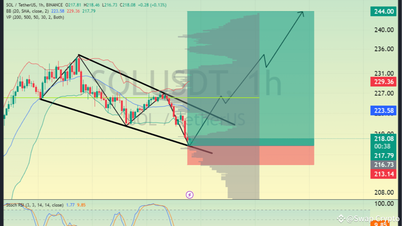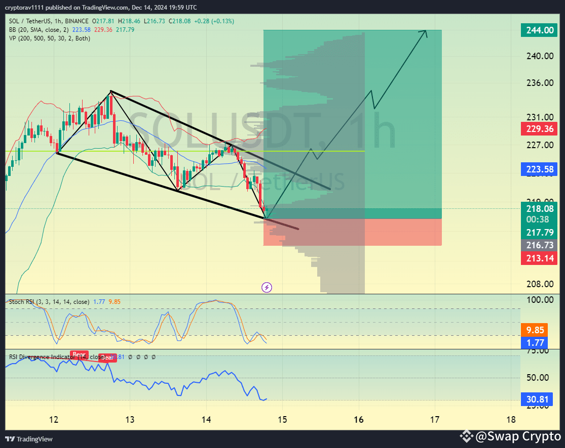 The SOL/USDT chart displays a falling wedge pattern, a bullish reversal signal. The Stochastic RSI indicates oversold conditions near 9.89, suggesting a potential upward bounce. The RSI Divergence Indicator is recovering from bearish momentum. Breakout confirmation above $223.58 aligns with volume profile support, targeting $244. Upward momentum strengthens as indicators suggest a bullish breakout.