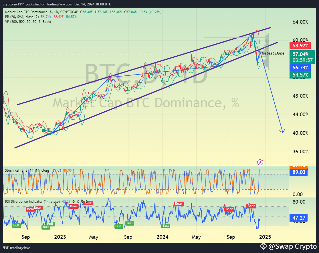 The BTC Dominance (BTC.D) chart reveals a breakdown below the rising channel, confirmed by a retest at 57%. Stochastic RSI at 89.03 indicates overbought conditions, suggesting potential dominance weakening. RSI Divergence Indicator shows bearish pressure near 47.26. This decline in dominance hints at capital rotation into altcoins, supporting a bullish outlook for SOL and other altcoins.
