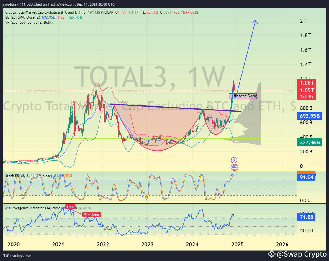 The TOTAL3 chart shows a bullish breakout after retesting prior resistance at $1.05T. The cup-and-handle pattern signals strength, supported by Bollinger Bands tightening, suggesting imminent volatility. Stochastic RSI at 91.04 indicates overbought momentum, while the RSI Divergence Indicator at 71.88 confirms bullish sentiment. These indicators reinforce the potential for a capital influx into altcoins, favoring SOL's bullish trend.