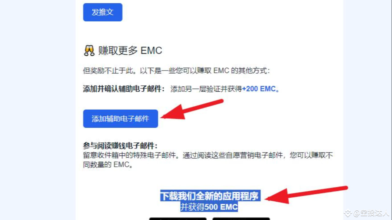 3、收件箱找到如下邮件,添加并确认辅助电子邮并获得+200 EMC:下载应用程序并获得500 EMC,ios或者古哥搜索EtherMail,下载即可。