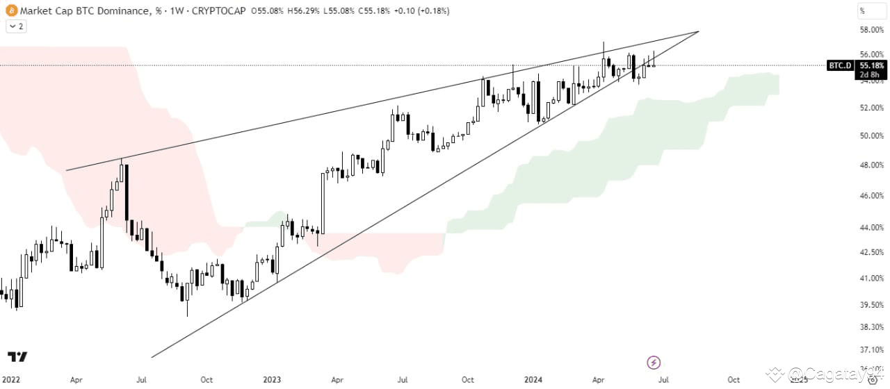 Bitcoin hakimiyet endeksi (BTC.D), haftalık zaman diliminde önemli bir teknik formasyon olan yükselen takoz paterninden kırıldı. Bu kırılma, piyasa yapısında olası bir değişiklik ve daha fazla düşüş potansiyeli anlamına gelebilir. Şu anda BTC.D, bu yükselen takozun alt sınırını yeniden test ediyor. Eğer bu yeniden test başarısız olursa ve BTC.D, Ichimoku bulutunun altına düşerse, kripto piyasasında önemli bir değişiklik yaşanabilir.