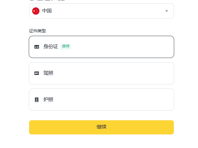 These three types of documents correspond to [Government-Issued ID Card], [Driver’s License], and [Passport]. Please select the type of document you wish to upload and then click [Continue].