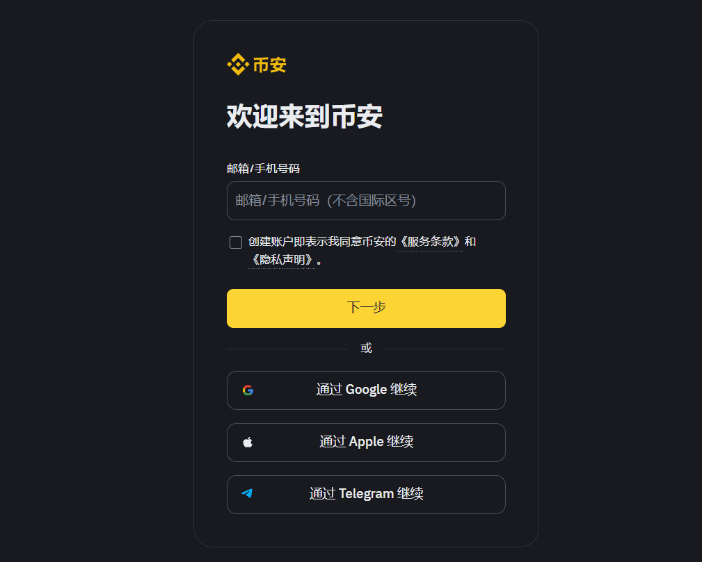 First, please visit the Binance official website through the link above to create an account. Then enter your email address or phone number.