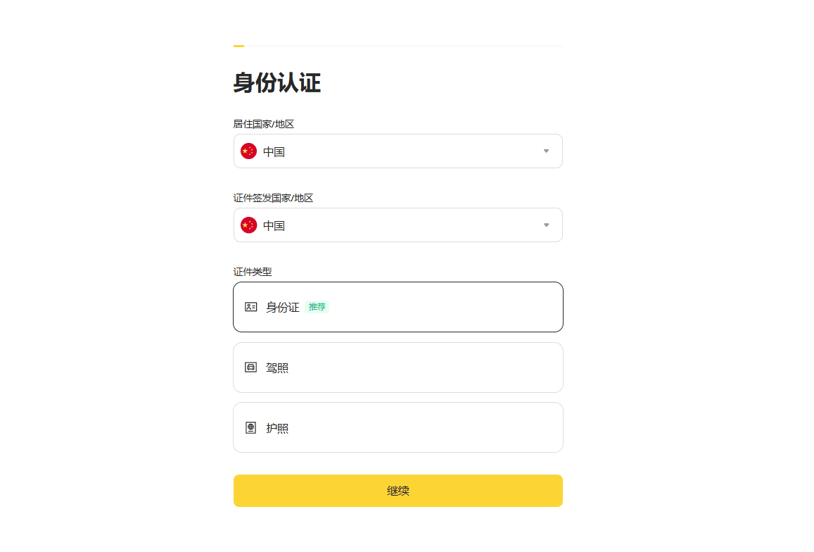 Now we enter the KYC identity verification stage. In this step, you need to choose a type of identification. You can choose a resident ID, driver's license, or passport; please select the most convenient document for you.