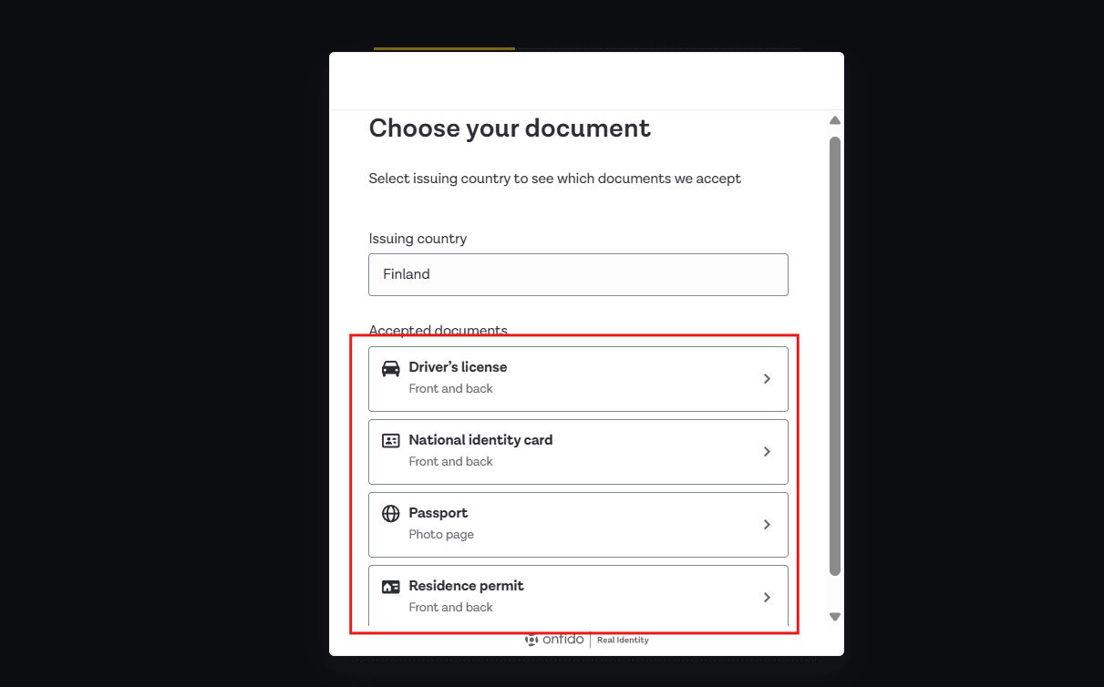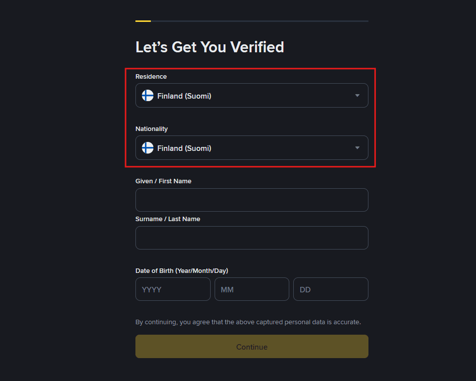 The first step is to select the country. The user must choose their country of residence, and at this stage, there may be specific restrictions or requirements for certain countries.