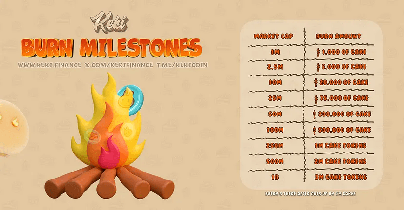 By correlating $CAKE’s success with their own, Keki’s approach establishes a reciprocal relationship. The team’s commitment to buybacks reflects their belief in fostering a robust relationship between CAKE From its inception, Keki envisioned itself as agv in CAKE ecosystem. The burning roadmap outlines strategic milestones where Keki will burn millions of dollars worth of $CAKE. As Keki achieves growth and hits milestones, these burns become a testament to its commitment to the BNBChain ecosystem.