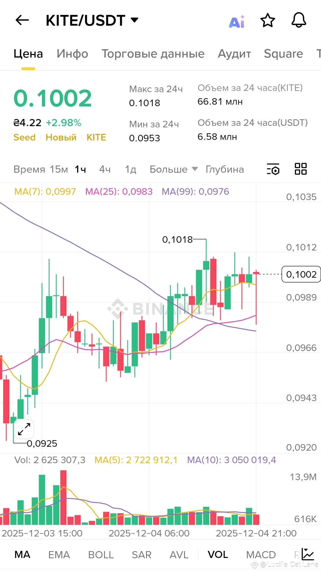 Цена $KITE сейчас 0,1002 – плюс 2,98% за сутки. И знаете, что меня цепляет в этих цифрах? Не сам рост. А то, как он выглядит на фоне того пути, который прошел токен от минимума 0,0953 до максимума 0,1018. Это почти 7% внутридневного диапазона, но мы закрываемся где-то посередине. Это не победное ралли. Это сомнение рынка, упакованное в зеленую свечу.