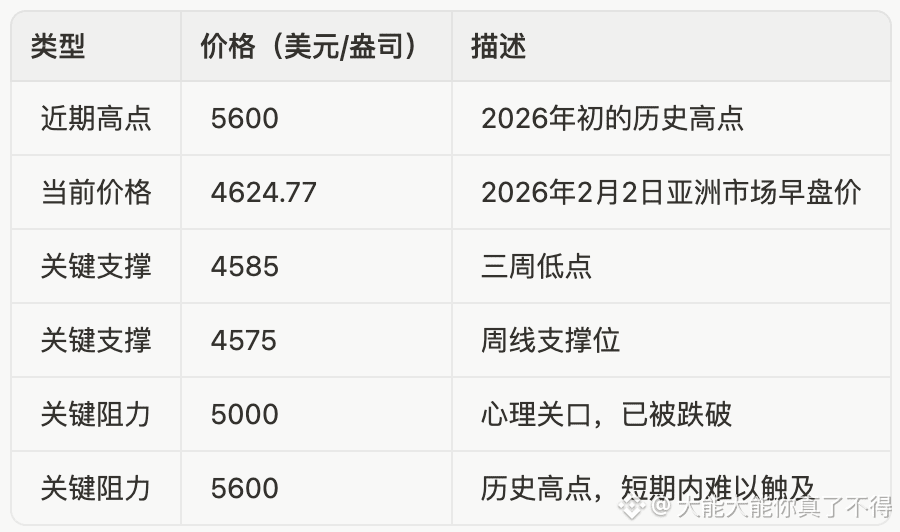 2026年2月2日,全球贵金属市场经历了剧烈震荡,黄金价格从年初的历史高点每盎司近5600美元急剧下跌,当日跌幅达到2.5%至3%左右,最低触及4697.97美元/盎司 。此次下跌主要受到地缘政治紧张局势缓和、美元走强以及技术面抛售压力的共同影响。尽管短期内金价承压,但瑞银和中信证券等机构仍对黄金的长期走势持乐观态度,认为此次回调是牛市中的一次必要调整 。本周将迎来一系列重要的经济数据发布,预计将对黄金市场产生进一步影响。