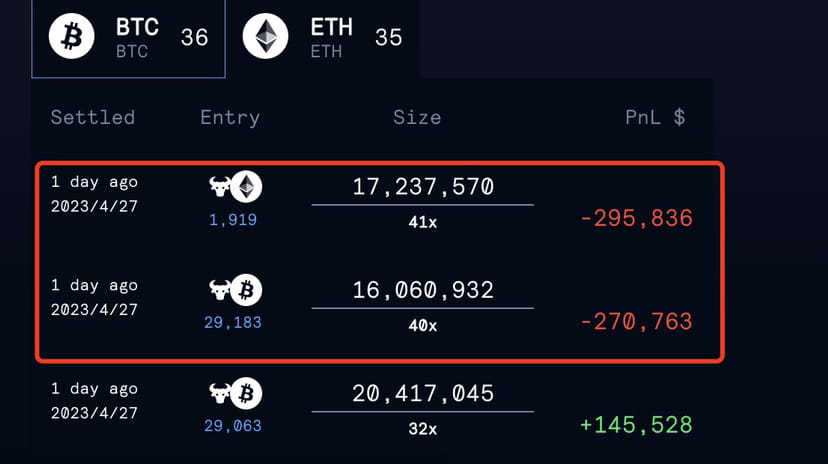 Breaking News: Andrew Kang (@Rewkang) suffered a massive loss of ~$567K yesterday after his BTC/ETH long position on #GMX was liquidated. He had used up to 41x leverage.