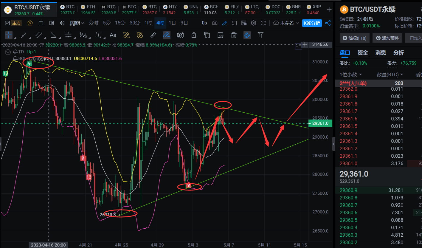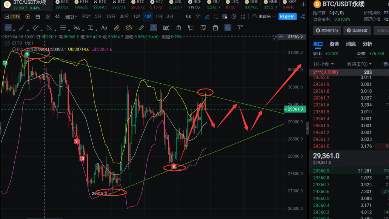 那么我们回归到行情趋势上面来。昨天BTC晚间数据出来后刚好砸到28650附近,也是前天的小低点附近后开始快速反弹,一路上涨到29850附近。我是给出了28800的挂单进场的。那么也是有1000点的利润了。早间开始回调,但是没有到我给出的3万附近的短空,比较可惜,现在回落到29320附近。不过我们之前低位的多单是可以继续持有的,行情也如期按照我说的在走。后续再突破3万暂时可能不会考虑空了,那样要是站稳了可能就加速上去了。我看迟早都是会破31000附近的新高的。 周线级别等过两天如果收完线还在29500附近上方站稳。下周还得上去。那么可能就看短期上面压力32600-32800附近的情况了。之前第一次在28500附近的时候。我就说30800-31000附近有压力。最后是触碰到31050就下来。震荡了一个多星期。下个星期就看会不会更上一个台阶了。所以看下周的情况了。短时间没啥说的,还是跟之前一样。只要回调就是进多的机会。上个星期听我这样讲的。都肯定跟着吃肉了最近给大家都有画图形的几个点位在那,你们可以多注意这几个点位。因为这几个图形的画的横线是非常重要的地方,如行情波动比大,可及时跟景财沟通。