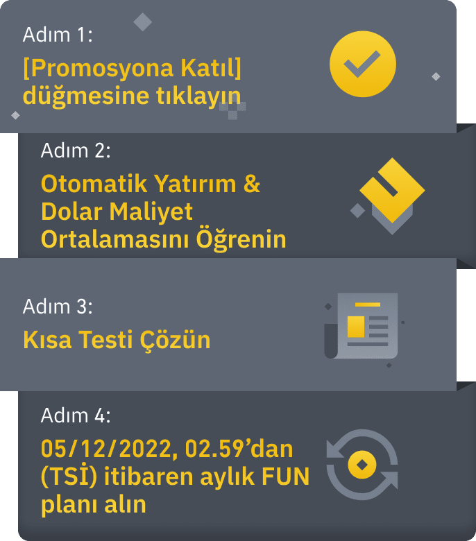 Binance, 07/11/2022 12:00 (TSİ) tarihinde, kullanıcıların Dolar-Maliyet Ortalaması ve Otomatik Yatırım hakkında bilgi edinebileceği yeni Otomatik Yatırım Testi etkinliğini başlatıyor. Katılımlarını başarılı biçimde doğrulayan ve promosyon dönemi içerisinde kısa testi çözen ilk 1.000.000 yeni Otomatik Yatırım kullanıcısının her biri, beş aylığına ücretsiz bir Otomatik Yatırım FUN aylık planı kazanacaktır.