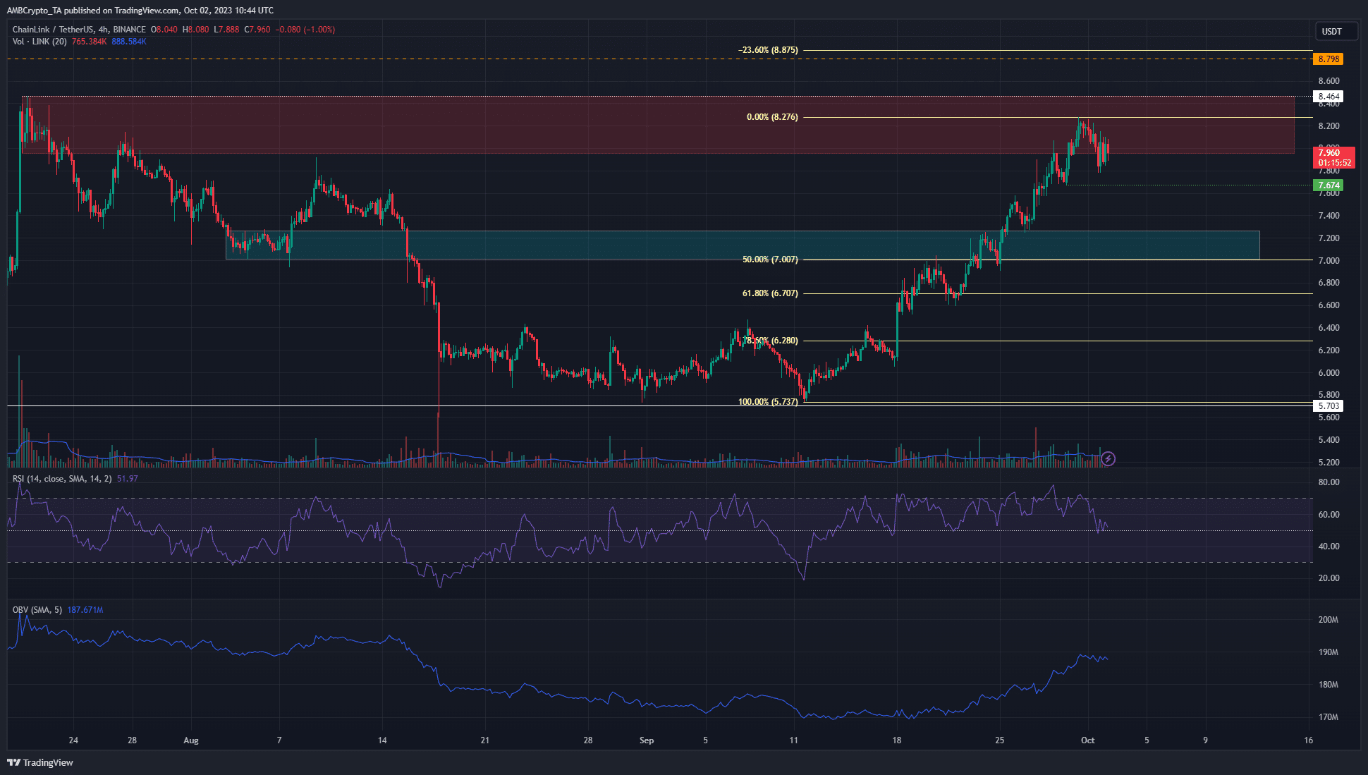 Over the weekend, the open positions remained steady due to the gradual decline in price from the $8.2 region. More concerning is the downward movement in Cumulative Volume Delta (CVD). This indicates that selling volume has dominated the spot markets in the past two days. Therefore, according to experts, it was possible for Chainlink to drop to $7.67 or even lower. Holding LINK in the $8 zone for an extended period may not be a good idea. Additionally, investors looking to short can wait for a break in the H4 market structure.