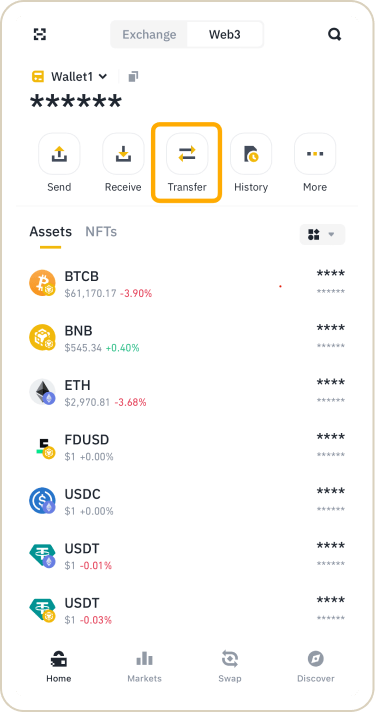 B6: Chuyển đến trang chủ ví Binance Web3. Bấm vào "Transfer".