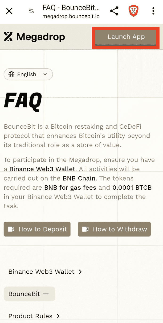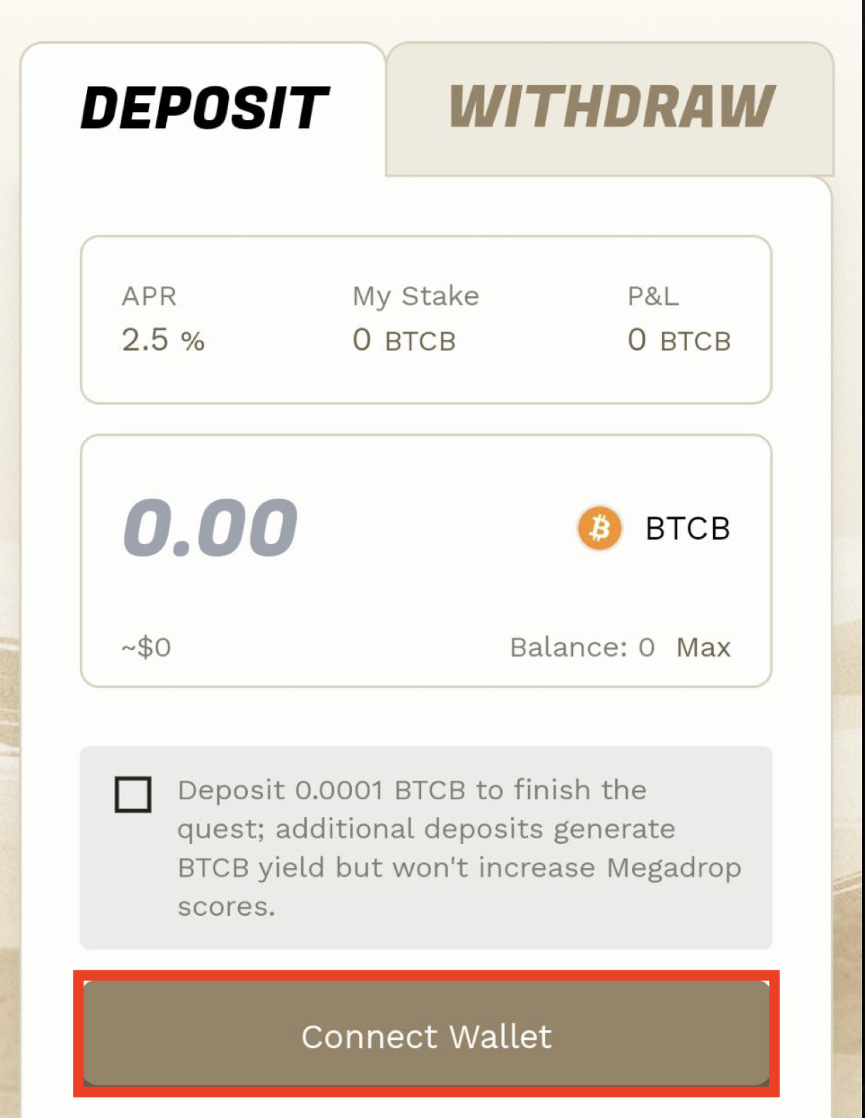 Để tham gia Megadrop, hãy đảm bảo bạn có Ví Binance Web3. Tất cả các hoạt động sẽ được thực hiện trên BNB Chain. Token cần có là BNB cho phí gas và 0,0001 BTCB trong Ví Binance Web3 của bạn để hoàn thành nhiệm vụ.