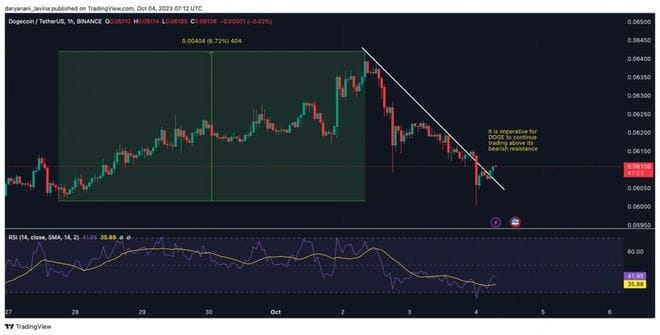 Do đó, dựa trên tâm lý chung của các nhà giao dịch, Dogecoin có khả năng bù đắp khoản lỗ gần đây của nhà đầu tư và chứng kiến giá tăng nhẹ trong 24 giờ tới. Vào thời điểm viết bài, DOGE đang giao dịch quanh mức 0,06108 USD, trên đường xu hướng giảm giá. DOGE phải tiếp tục duy trì trên ngưỡng kháng cự này trong vài giờ tới. Tuy nhiên, nếu điều này không được thực hiện, lập luận tăng giá sẽ thất bại. #BTC #ETH