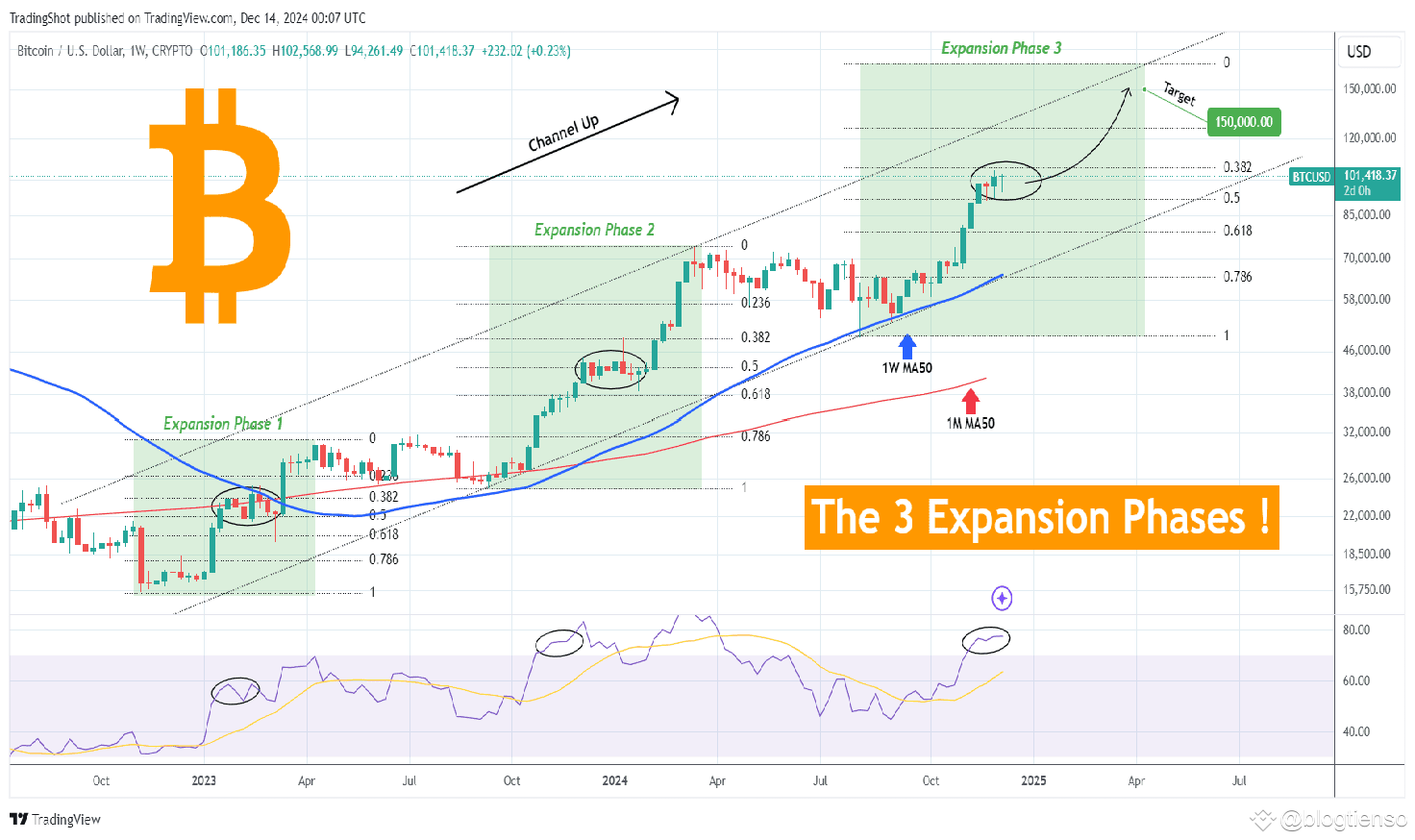 Chu kỳ hiện tại của Bitcoin có thể được chia thành ba "Giai đoạn mở rộng" chính. Mỗi giai đoạn được đánh dấu bằng một đợt tăng, sau đó là một đợt củng cố và sau đó là một đợt tăng đột biến khác. Sau đây là cái nhìn sâu hơn về các đặc điểm của các giai đoạn này: