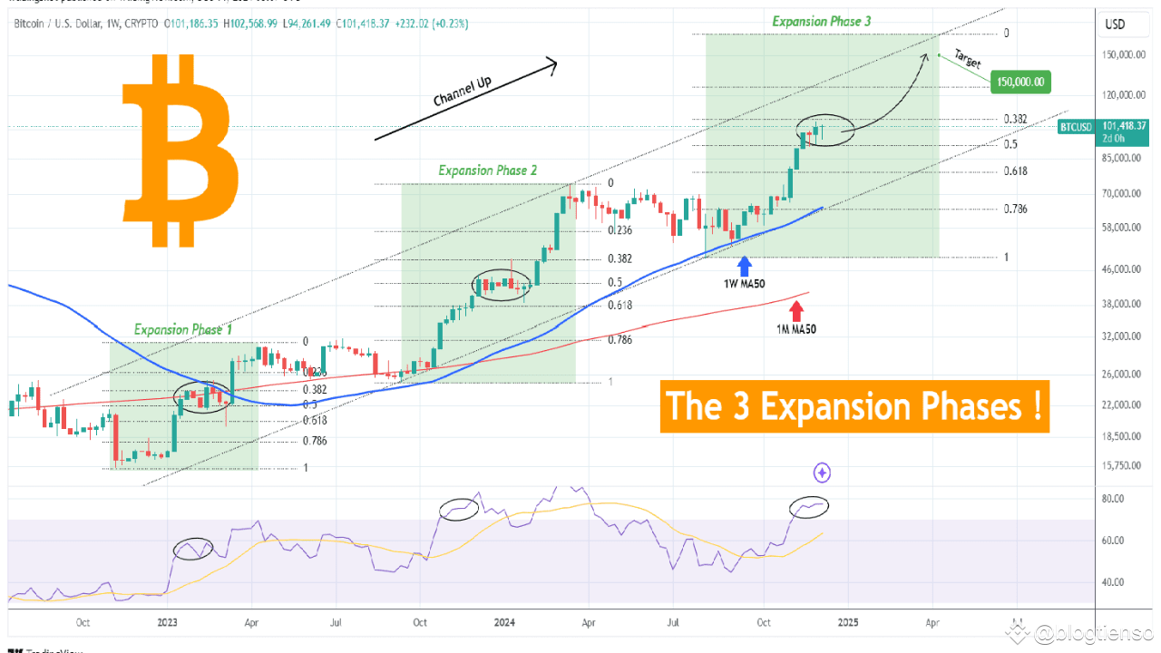 Ban đầu được thảo luận vào tháng 8, mô hình này đã đặt nền tảng cho các dự đoán rằng Bitcoin có thể đạt 100.000 đô la. Tuy nhiên, khi xem xét kỹ hơn bằng khung thời gian 1W (một tuần) cho thấy tiềm năng thậm chí còn rộng hơn, với mục tiêu 150.000 đô la trước mùa hè.