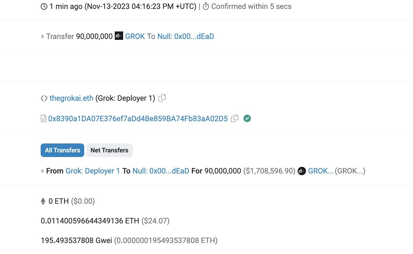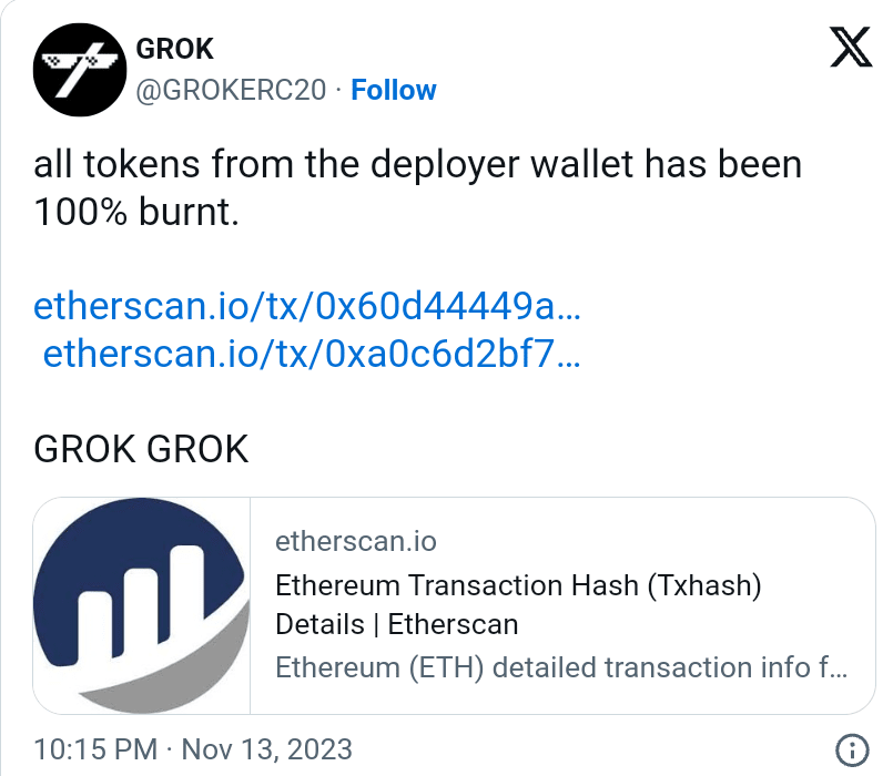 Trong nỗ lực cứu vãn tình hình, nhóm phát triển GROK được cho là đã gửi số token trị giá khoảng 1,7 triệu đô la đến một địa chỉ đốt. Động thái này nhằm mục đích giảm nguồn cung cấp token và xây dựng lại niềm tin của các nhà đầu tư. Tài khoản X được liên kết với GROK sau đó tuyên bố rằng nhóm đã đốt tất cả token từ địa chỉ người triển khai, tương đương 180 triệu GROK, trị giá khoảng 2 triệu USD theo giá hiện tại.