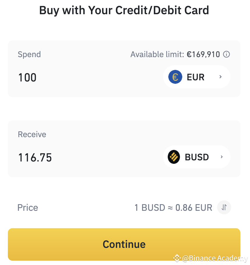 Nếu bạn muốn mua UNI bằng tiền mã hoá, bạn có thể mua rồi chuyển tiền vào Ví Giao Ngay của mình hoặc mua trực tiếp trên sàn Binance. BUSD là một trong những lựa chọn được khuyến nghị vì giá của nó ổn định. Bạn có thể mua BUSD từ thẻ thanh ngân hàng bằng cách truy cập trang [Buy Crypto]. Nhập số tiền bạn muốn mua và nhấp vào [Continue] để điền thông tin chi tiết thẻ của bạn.