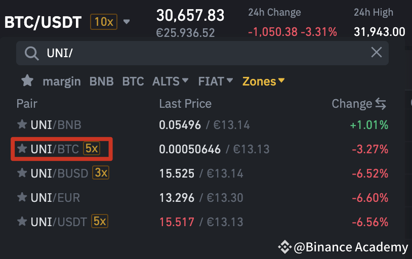 Sử dụng thanh tìm kiếm để tìm cặp bạn muốn. Trong trường hợp này, hãy nhấp vào [UNI/BTC].