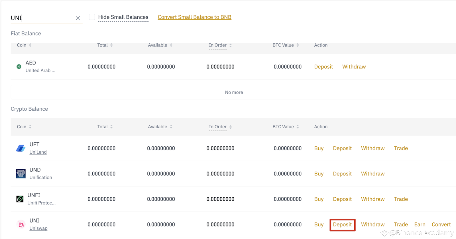 Bán UNI là một quá trình tương tự như mua nó. Trước tiên, hãy đảm bảo bạn có sẵn UNI trong Ví Binance Giao Ngay của mình. Nếu bạn chưa nạp token, hãy truy cập trang [Fiat and Spot] và tìm kiếm UNI. Nhấp vào [Deposit] để được hướng dẫn chi tiết về cách chuyển UNI của bạn. Bạn cũng có thể đọc Hướng dẫn cách nạp tiền mã hóa trên Binance của để được trợ giúp thêm.