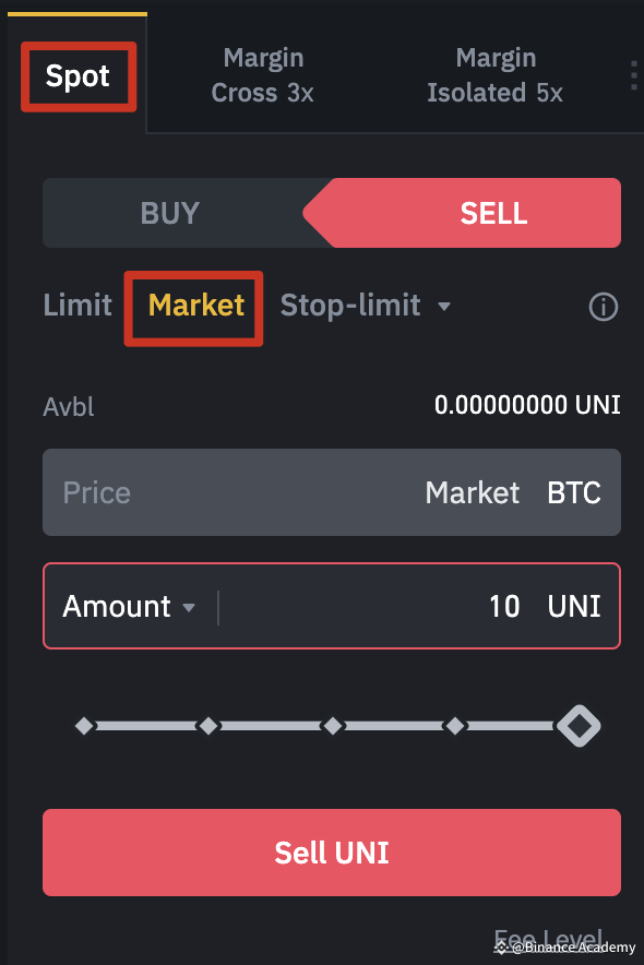 Để bán UNI của bạn với giá thị trường ngay hiện tại, hãy chuyển sang phía bên phải của màn hình. Nhấp vào [Spot] và chọn [Market] làm loại lệnh trong tab [Sell]. Nhập số lượng UNI bạn muốn bán và nhấp vào [Sell UNI].