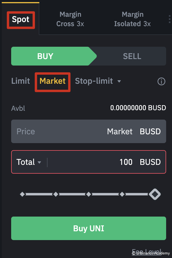 Để tạo lệnh Thị trường của bạn, hãy chuyển sang phía bên phải của giao diện sàn và nhấp vào [Spot]. Đảm bảo bạn đã chọn [Market] làm loại lệnh bên dưới tab [Buy] và nhập số lượng BUSD bạn muốn giao dịch. Cuối cùng, nhấp vào [Buy UNI] để đặt hàng.