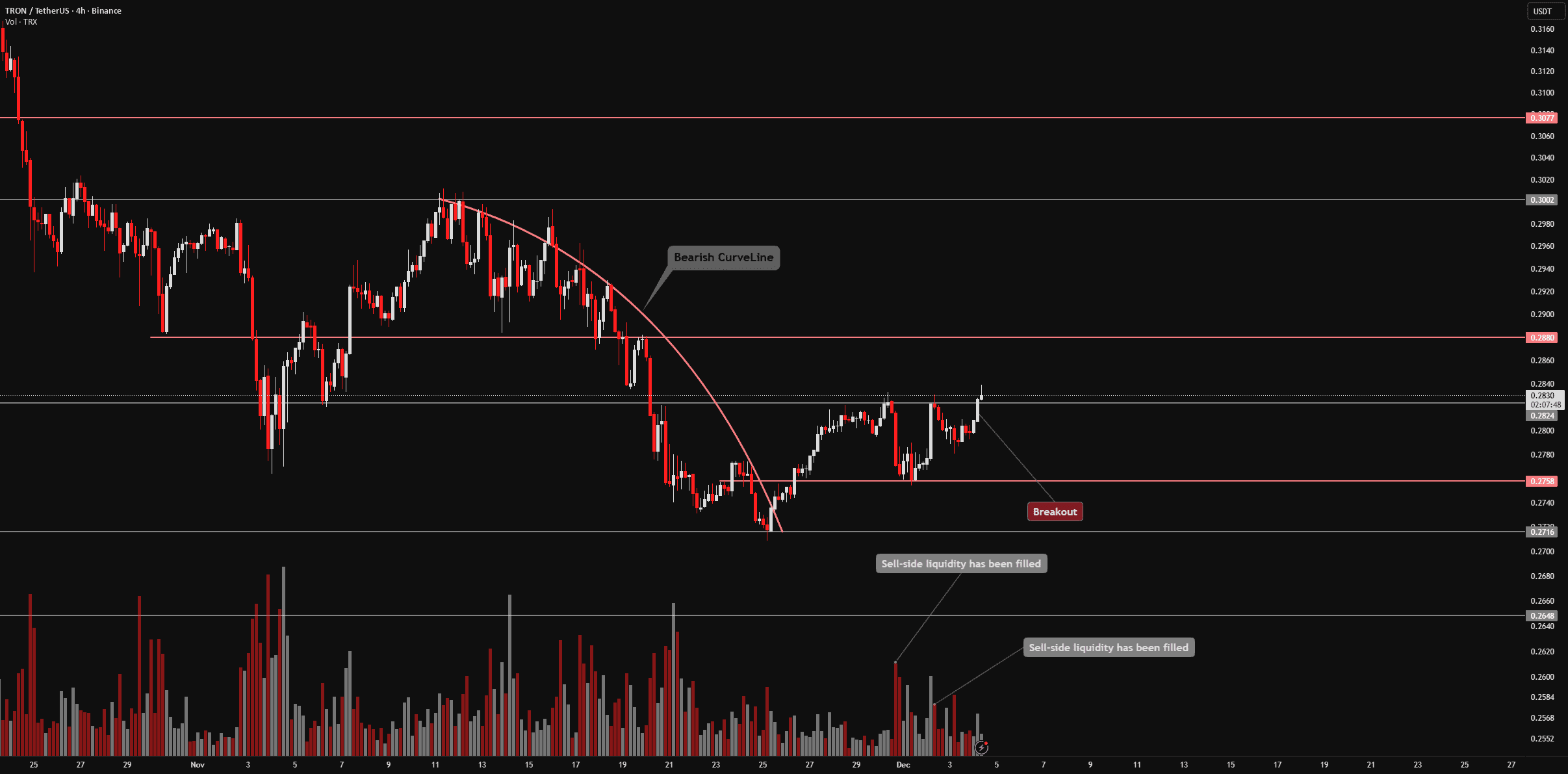 TRX成功突破$0.2824的阻力,现在正在向上推升。